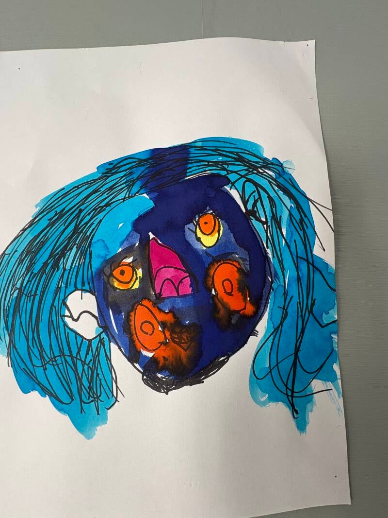We starten met het tekenen van elkaar, zonder de pen van het papier op te tillen. Daarnaast mag je niet naar je papier kijken. Op deze manier ontstaan er prachtige, abstracte gezichten.